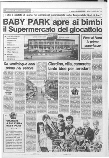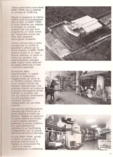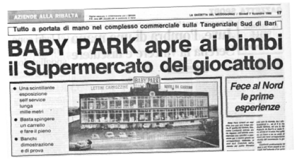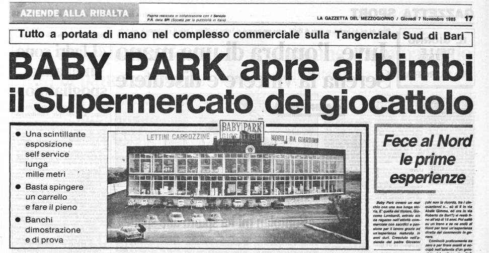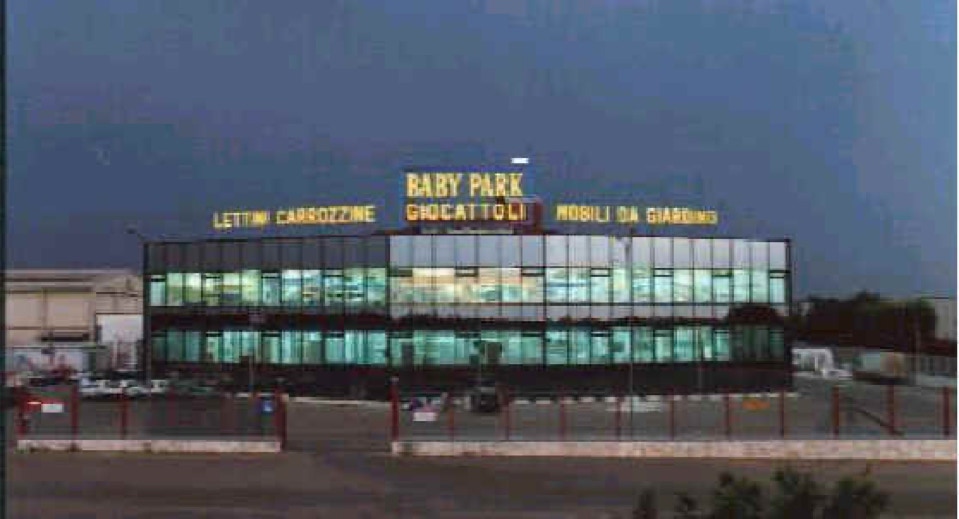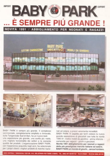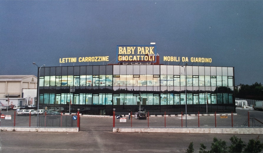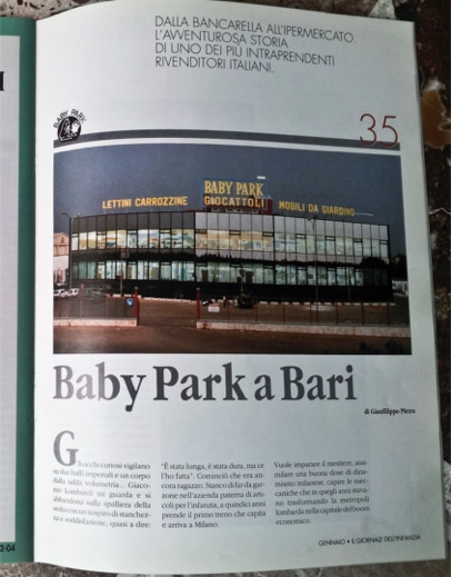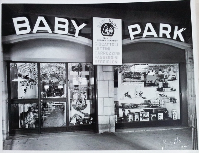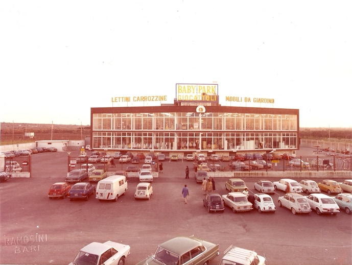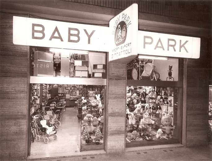 Nel 1966 registrò a Milano il marchio BABY PARK, per poi, nel 1973 iniziare i lavori di costruzione del più grande centro commerciale al dettaglio mono settoriale d’Europa. Il complesso si estendeva su una superficie di circa 10.000 mq. alla periferia della città, affacciato sulla strada di più importante della regione, la SS 16 che ancor oggi rappresenta una fondamentale via di scorrimento verso Sud. Scelta assurda per quell’epoca, quando, fin dal dopo guerra, i negozi al dettaglio “alla strada” erano concentrati unicamente nei centri cittadini.